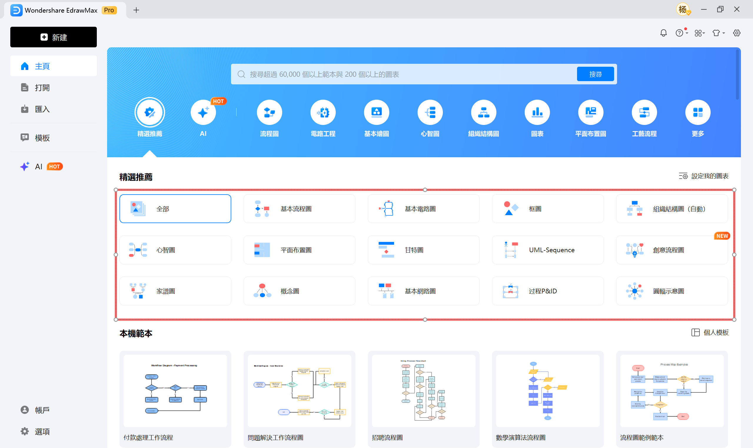 以 EdrawMax 為例,在「新增」時選擇「基本流程圖」範本,就能直接套用預設格式,不必從零開始繪製。這讓流程圖製作變得非常直覺。