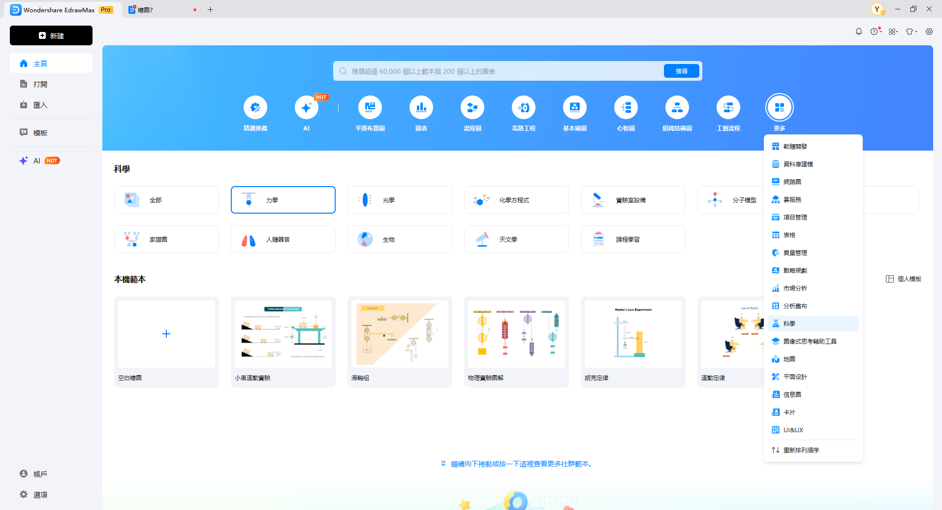 開啟 EdrawMax 後,依序點選【主頁】>【更多】>【科學】。